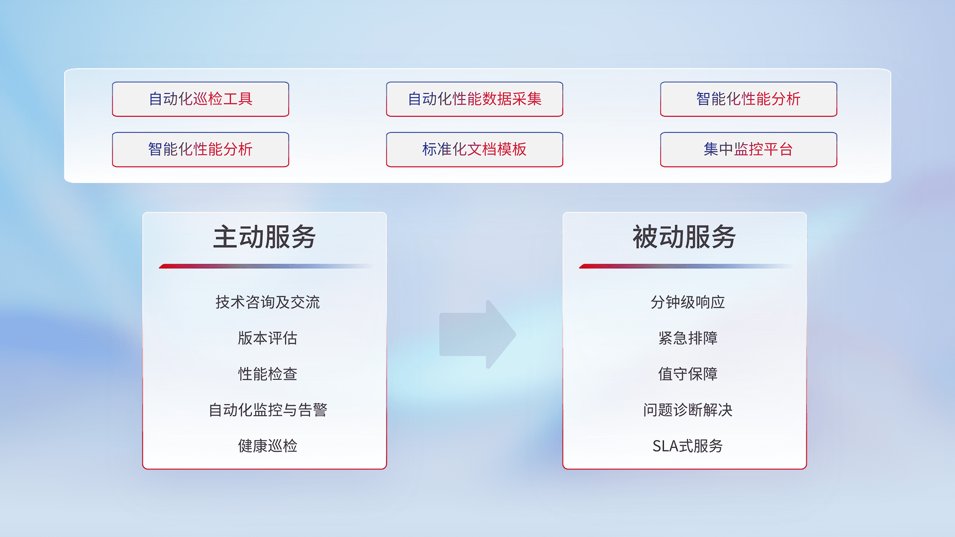 智能化工具和标准化文档,,保障服务质量,,,提供主动服务(包含技术咨询、、、版本评估、、性能检查、、、自动化监控与告警、、、、健康巡检)和被动服务包含(分钟级响应、、、、紧急排障、、、、值守保障、、、、问题诊断解决、、SLA服务)。。。